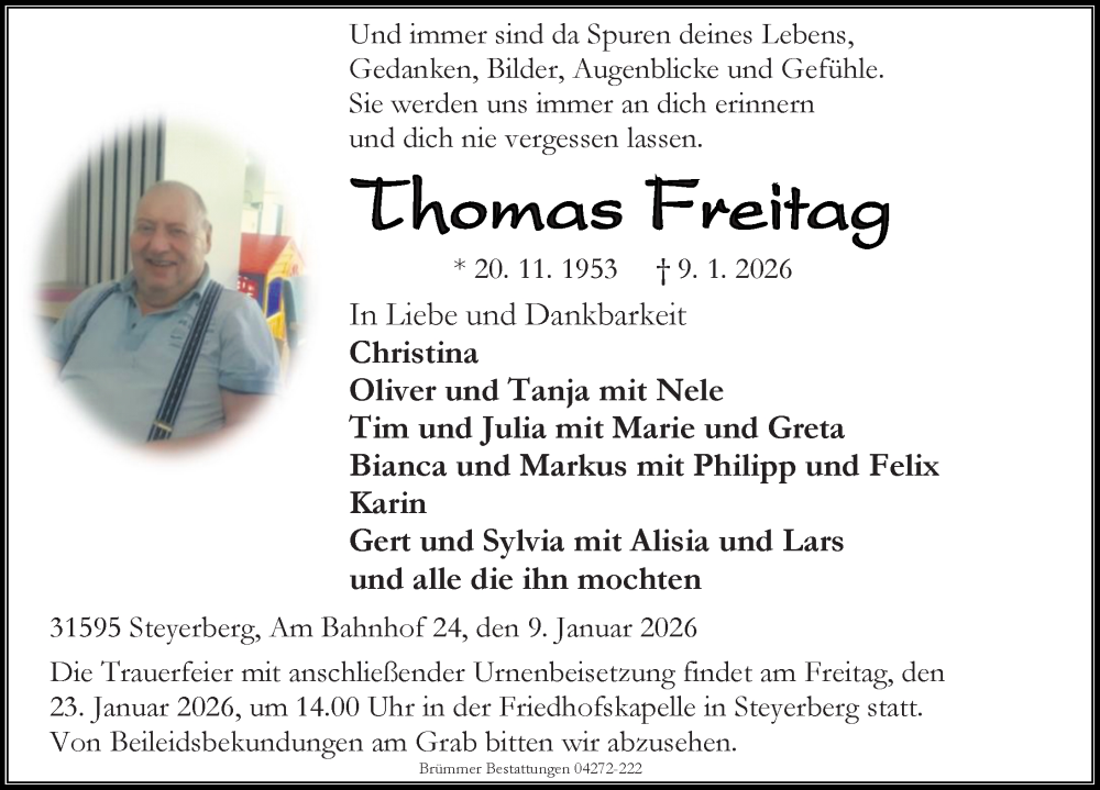 Hier finden Sie alle Traueranzeigen aus der Zeitung, die bisher für Thomas Freitag erschienen sind. Weitere Traueranzeigen, die in der Zeitung erscheinen, werden hier ebenfalls aufgelistet