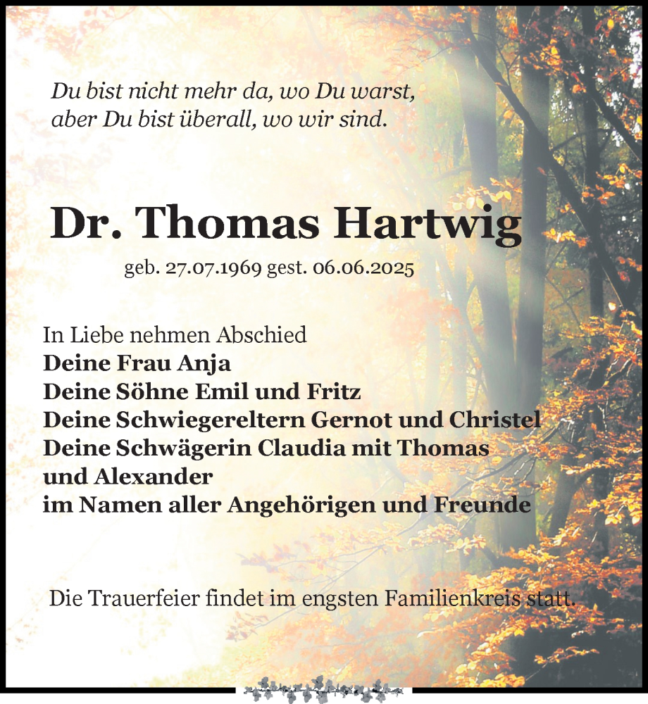 Hier finden Sie alle Traueranzeigen aus der Zeitung, die bisher für Thomas Hartwig erschienen sind. Weitere Traueranzeigen, die in der Zeitung erscheinen, werden hier ebenfalls aufgelistet