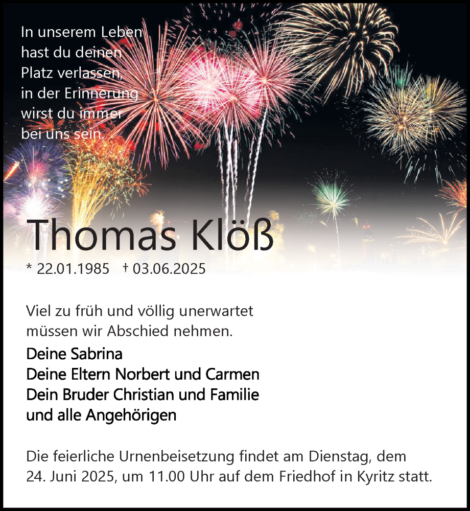 Hier finden Sie alle Traueranzeigen aus der Zeitung, die bisher für Thomas Klöß erschienen sind. Weitere Traueranzeigen, die in der Zeitung erscheinen, werden hier ebenfalls aufgelistet