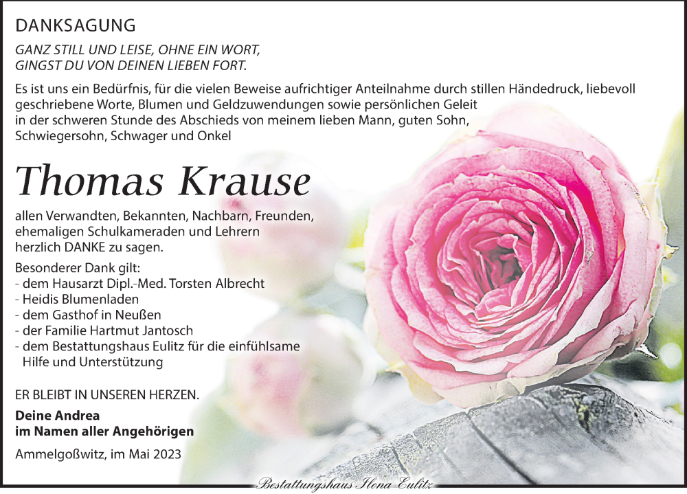 Hier finden Sie alle Traueranzeigen aus der Zeitung, die bisher für Thomas Krause erschienen sind. Weitere Traueranzeigen, die in der Zeitung erscheinen, werden hier ebenfalls aufgelistet