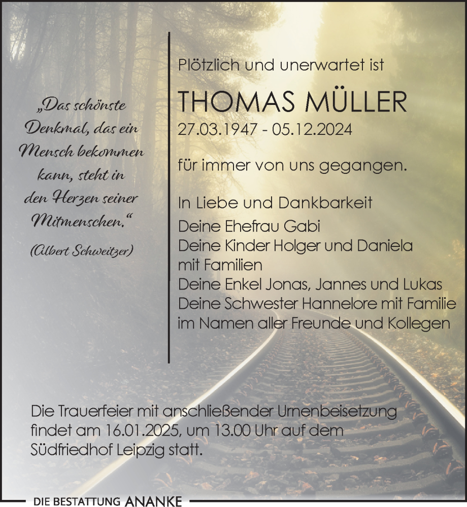Hier finden Sie alle Traueranzeigen aus der Zeitung, die bisher für Thomas Müller erschienen sind. Weitere Traueranzeigen, die in der Zeitung erscheinen, werden hier ebenfalls aufgelistet