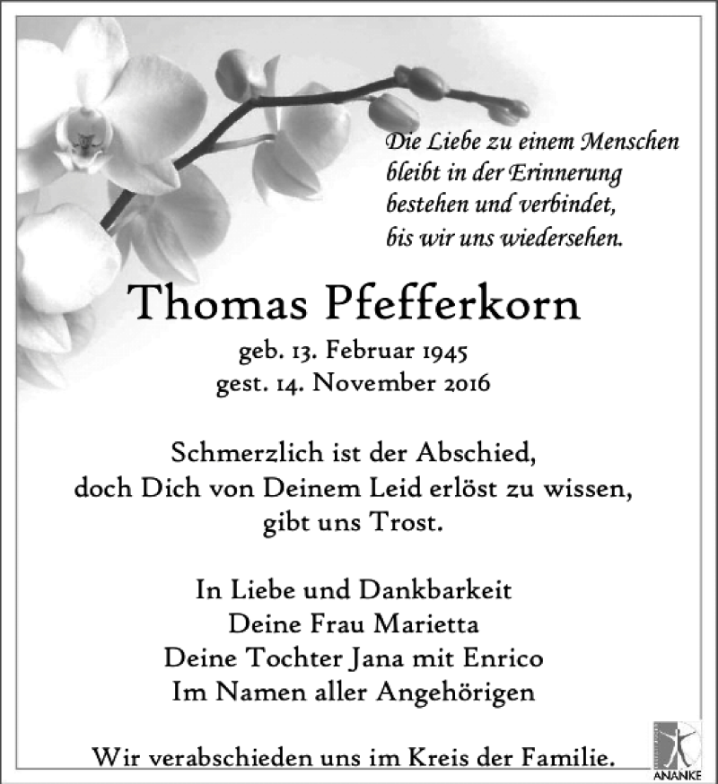 Hier finden Sie alle Traueranzeigen aus der Zeitung, die bisher für Thomas Pfefferkorn erschienen sind. Weitere Traueranzeigen, die in der Zeitung erscheinen, werden hier ebenfalls aufgelistet