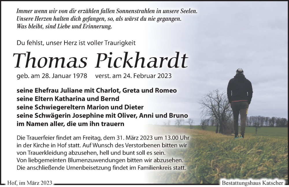 Hier finden Sie alle Traueranzeigen aus der Zeitung, die bisher für Thomas Pickhardt erschienen sind. Weitere Traueranzeigen, die in der Zeitung erscheinen, werden hier ebenfalls aufgelistet