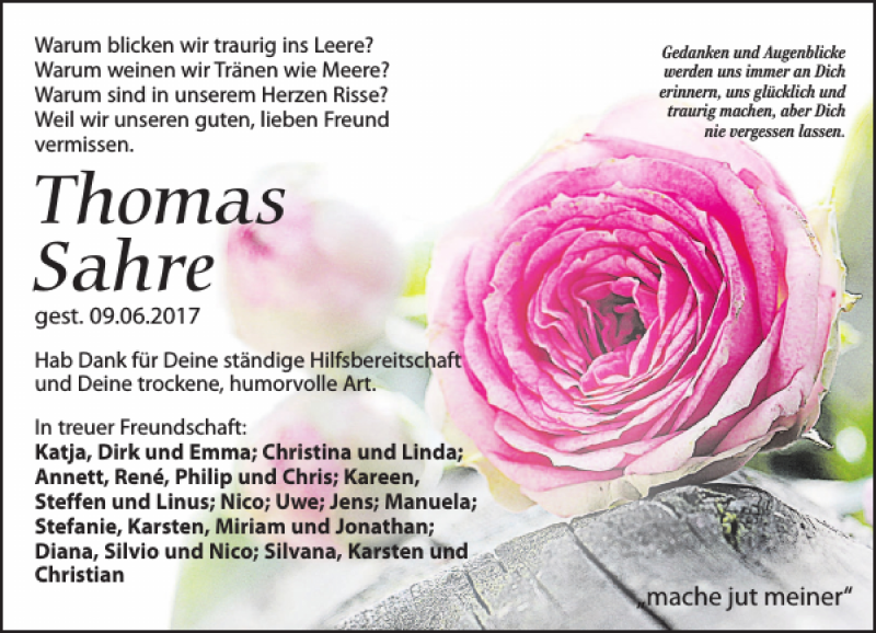 Hier finden Sie alle Traueranzeigen aus der Zeitung, die bisher für Thomas Sahre erschienen sind. Weitere Traueranzeigen, die in der Zeitung erscheinen, werden hier ebenfalls aufgelistet