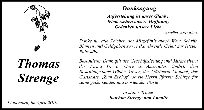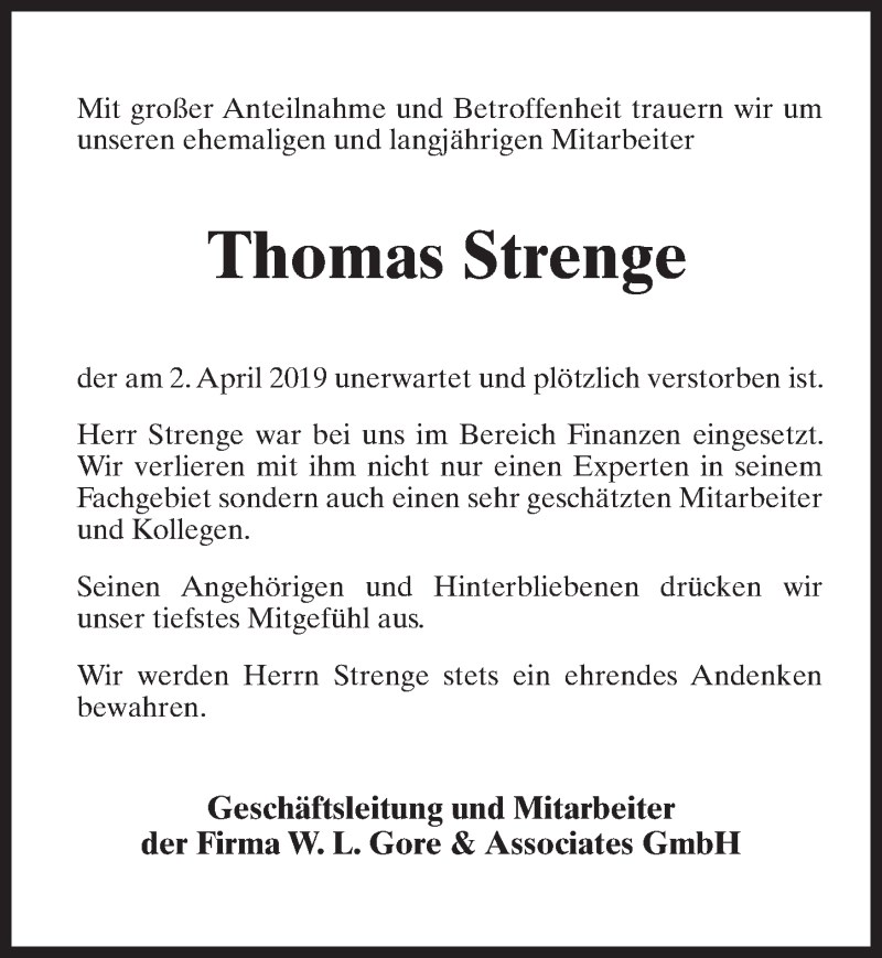 Hier finden Sie alle Traueranzeigen aus der Zeitung, die bisher für Thomas Strenge erschienen sind. Weitere Traueranzeigen, die in der Zeitung erscheinen, werden hier ebenfalls aufgelistet