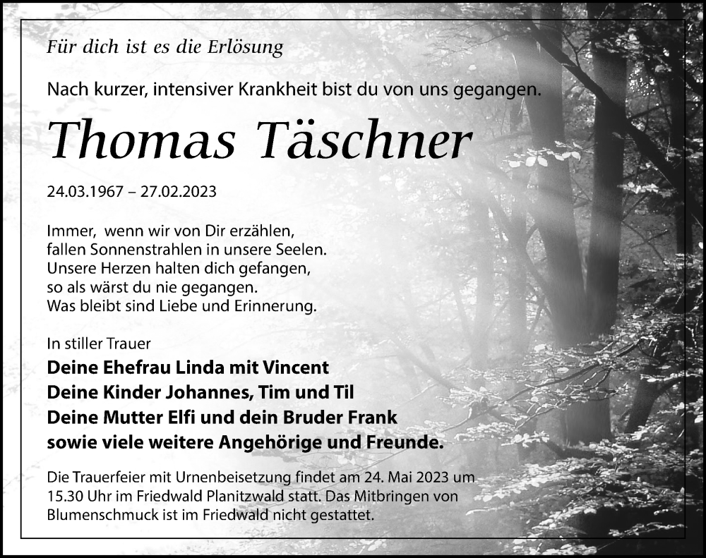 Hier finden Sie alle Traueranzeigen aus der Zeitung, die bisher für Thomas Täschner erschienen sind. Weitere Traueranzeigen, die in der Zeitung erscheinen, werden hier ebenfalls aufgelistet