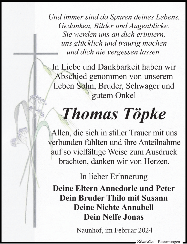 Hier finden Sie alle Traueranzeigen aus der Zeitung, die bisher für Thomas Töpke erschienen sind. Weitere Traueranzeigen, die in der Zeitung erscheinen, werden hier ebenfalls aufgelistet
