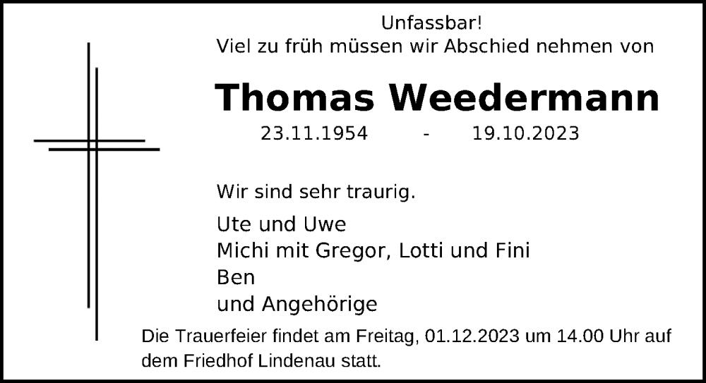 Hier finden Sie alle Traueranzeigen aus der Zeitung, die bisher für Thomas Weedermann erschienen sind. Weitere Traueranzeigen, die in der Zeitung erscheinen, werden hier ebenfalls aufgelistet