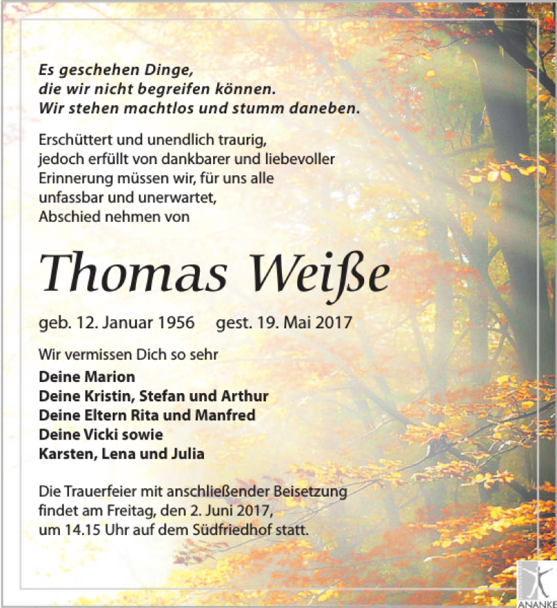 Hier finden Sie alle Traueranzeigen aus der Zeitung, die bisher für Thomas Weiße erschienen sind. Weitere Traueranzeigen, die in der Zeitung erscheinen, werden hier ebenfalls aufgelistet