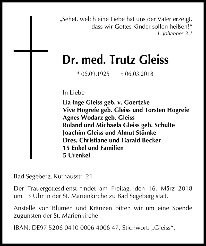 Hier finden Sie alle Traueranzeigen aus der Zeitung, die bisher für Trutz Gleiss erschienen sind. Weitere Traueranzeigen, die in der Zeitung erscheinen, werden hier ebenfalls aufgelistet