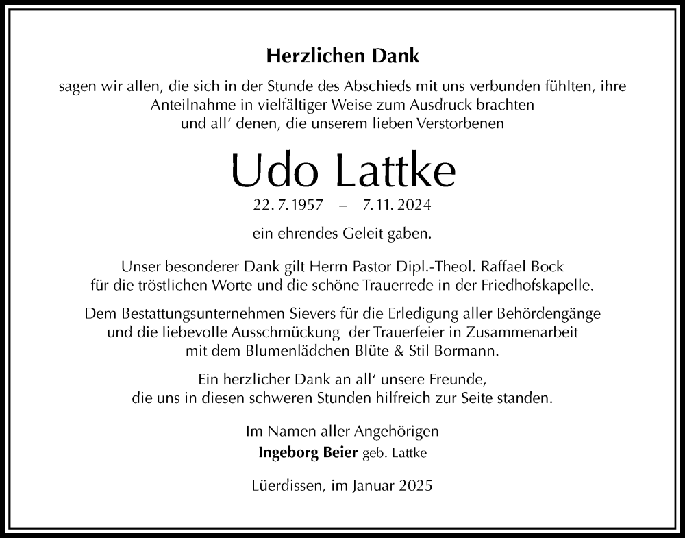 Hier finden Sie alle Traueranzeigen aus der Zeitung, die bisher für Udo Lattke erschienen sind. Weitere Traueranzeigen, die in der Zeitung erscheinen, werden hier ebenfalls aufgelistet