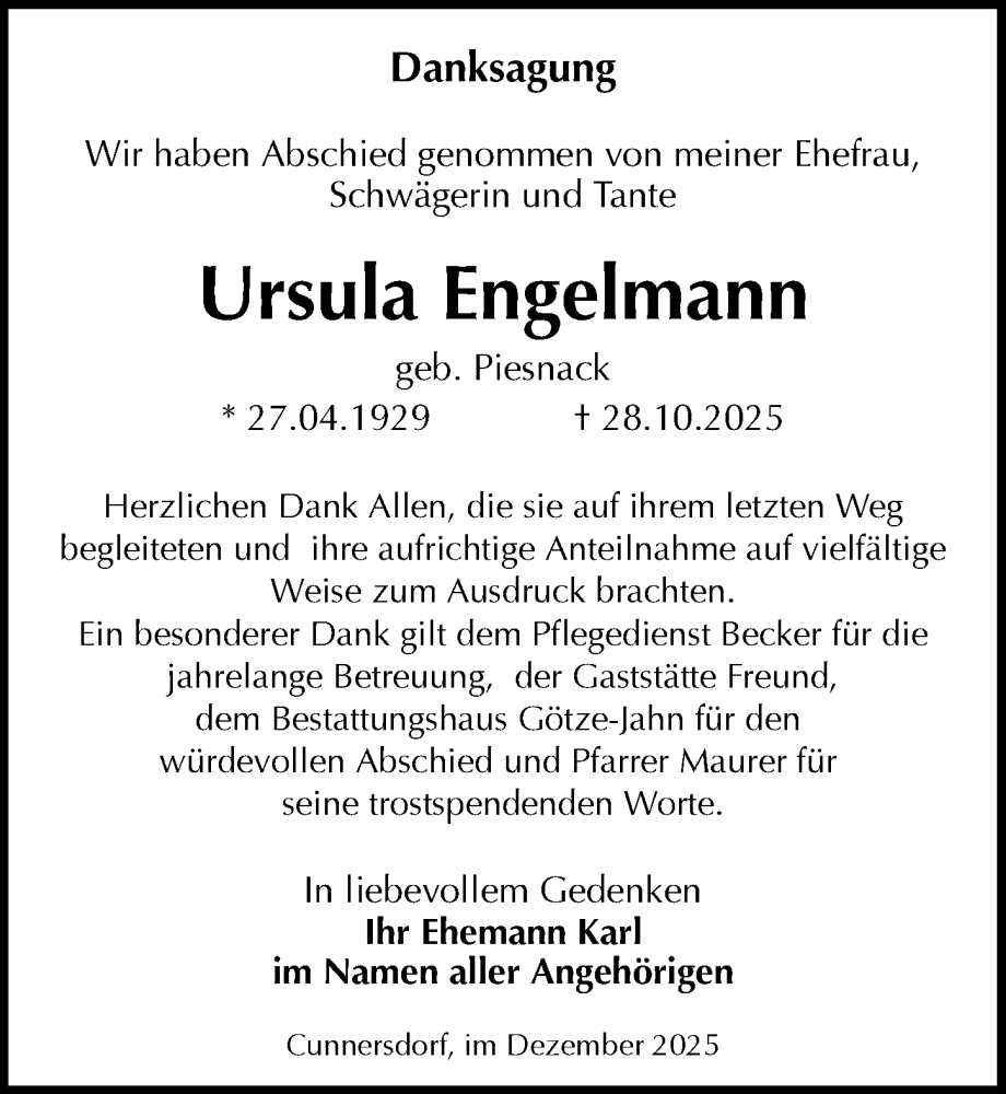 Hier finden Sie alle Traueranzeigen aus der Zeitung, die bisher für Ursula Engelmann erschienen sind. Weitere Traueranzeigen, die in der Zeitung erscheinen, werden hier ebenfalls aufgelistet