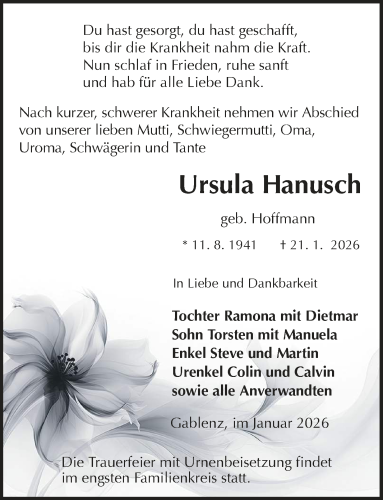 Hier finden Sie alle Traueranzeigen aus der Zeitung, die bisher für Ursula Hanusch erschienen sind. Weitere Traueranzeigen, die in der Zeitung erscheinen, werden hier ebenfalls aufgelistet