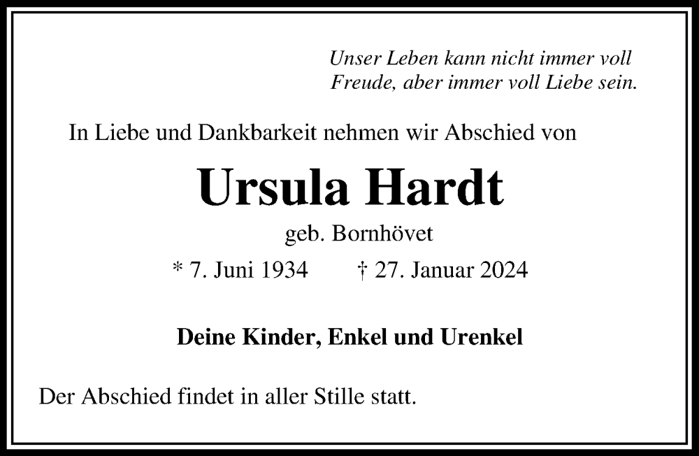 Hier finden Sie alle Traueranzeigen aus der Zeitung, die bisher für Ursula Hardt erschienen sind. Weitere Traueranzeigen, die in der Zeitung erscheinen, werden hier ebenfalls aufgelistet