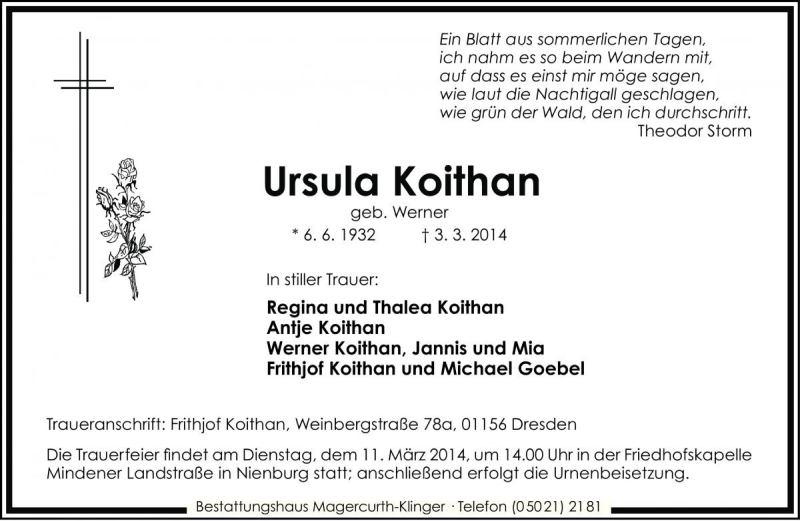 Hier finden Sie alle Traueranzeigen aus der Zeitung, die bisher für Ursula Koithan erschienen sind. Weitere Traueranzeigen, die in der Zeitung erscheinen, werden hier ebenfalls aufgelistet
