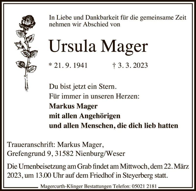 Hier finden Sie alle Traueranzeigen aus der Zeitung, die bisher für Ursula Mager erschienen sind. Weitere Traueranzeigen, die in der Zeitung erscheinen, werden hier ebenfalls aufgelistet