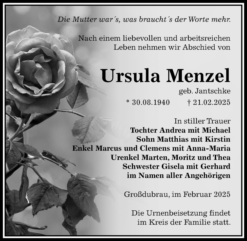 Hier finden Sie alle Traueranzeigen aus der Zeitung, die bisher für Ursula Menzel erschienen sind. Weitere Traueranzeigen, die in der Zeitung erscheinen, werden hier ebenfalls aufgelistet