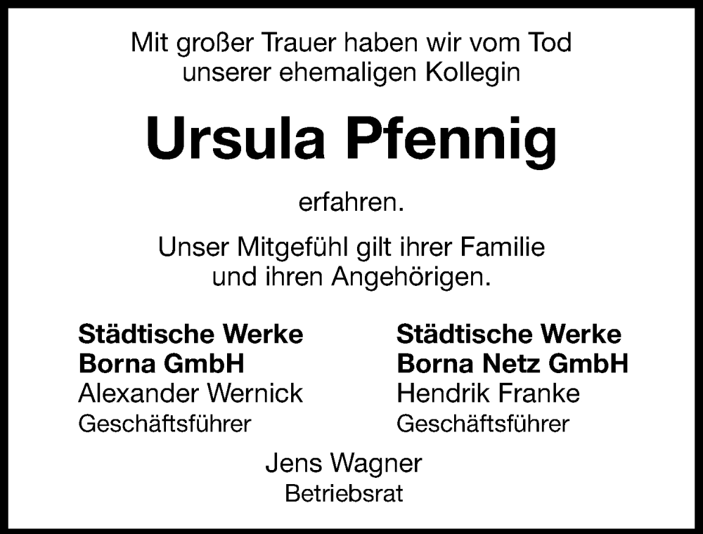 Hier finden Sie alle Traueranzeigen aus der Zeitung, die bisher für Ursula Pfennig erschienen sind. Weitere Traueranzeigen, die in der Zeitung erscheinen, werden hier ebenfalls aufgelistet
