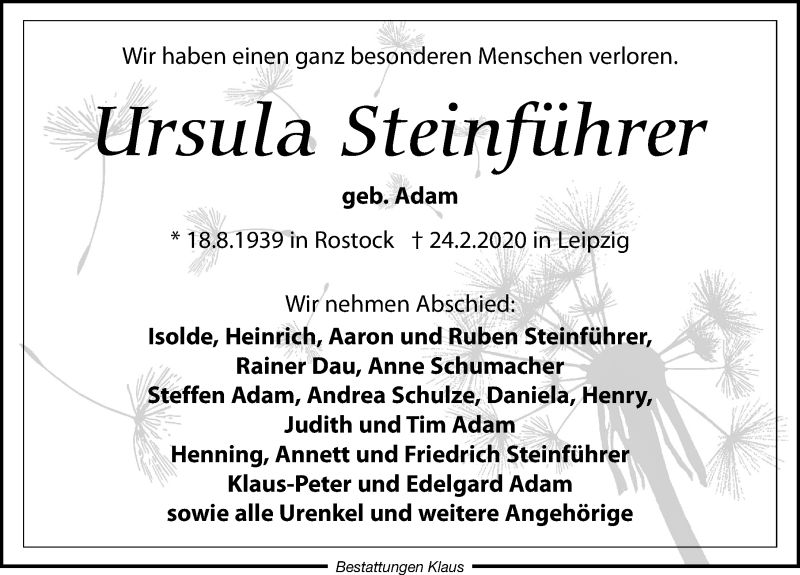 Hier finden Sie alle Traueranzeigen aus der Zeitung, die bisher für Ursula Steinführer erschienen sind. Weitere Traueranzeigen, die in der Zeitung erscheinen, werden hier ebenfalls aufgelistet
