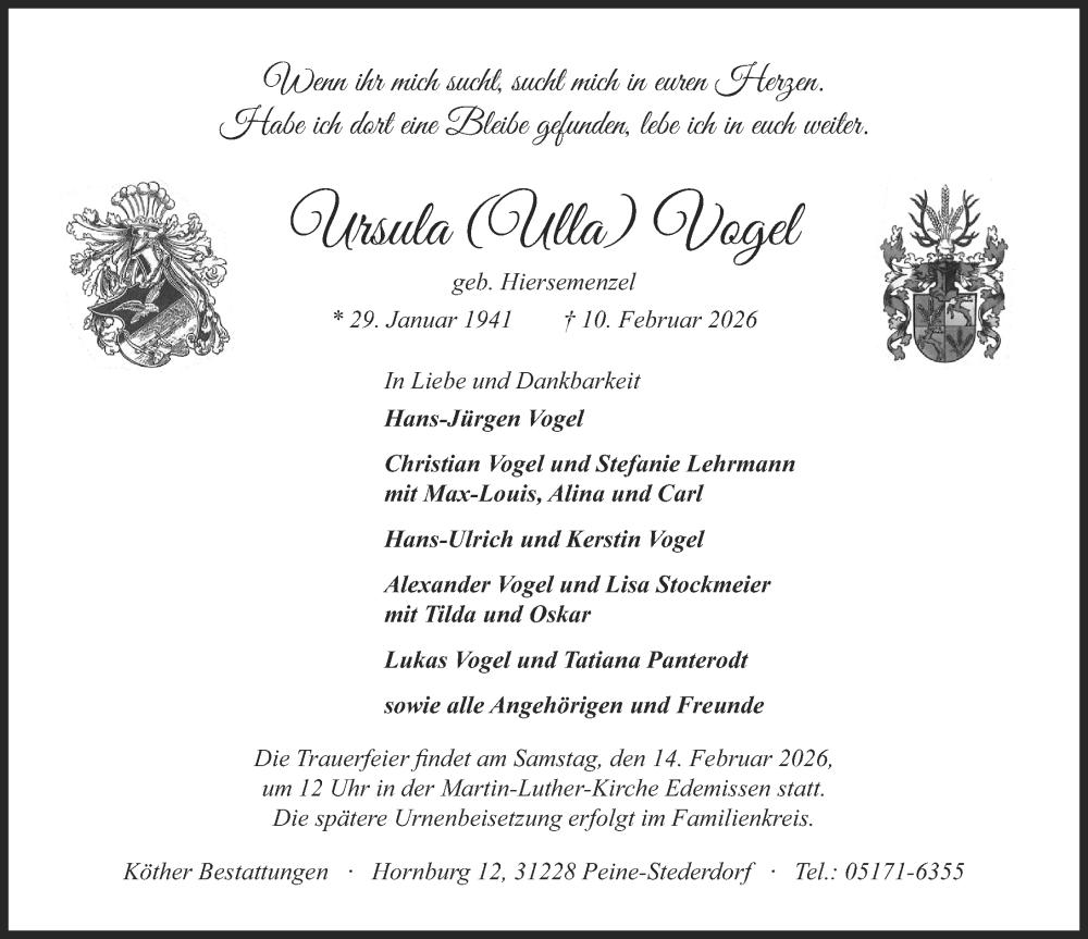 Hier finden Sie alle Traueranzeigen aus der Zeitung, die bisher für Ursula Vogel erschienen sind. Weitere Traueranzeigen, die in der Zeitung erscheinen, werden hier ebenfalls aufgelistet
