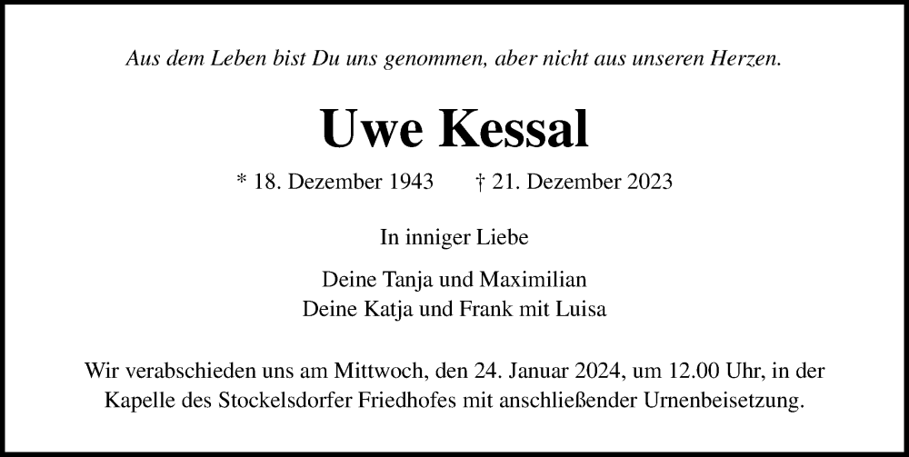 Hier finden Sie alle Traueranzeigen aus der Zeitung, die bisher für Uwe Kessal erschienen sind. Weitere Traueranzeigen, die in der Zeitung erscheinen, werden hier ebenfalls aufgelistet