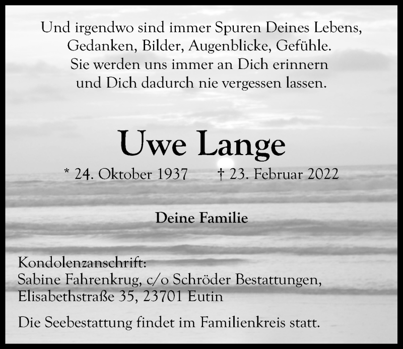 Hier finden Sie alle Traueranzeigen aus der Zeitung, die bisher für Uwe Lange erschienen sind. Weitere Traueranzeigen, die in der Zeitung erscheinen, werden hier ebenfalls aufgelistet