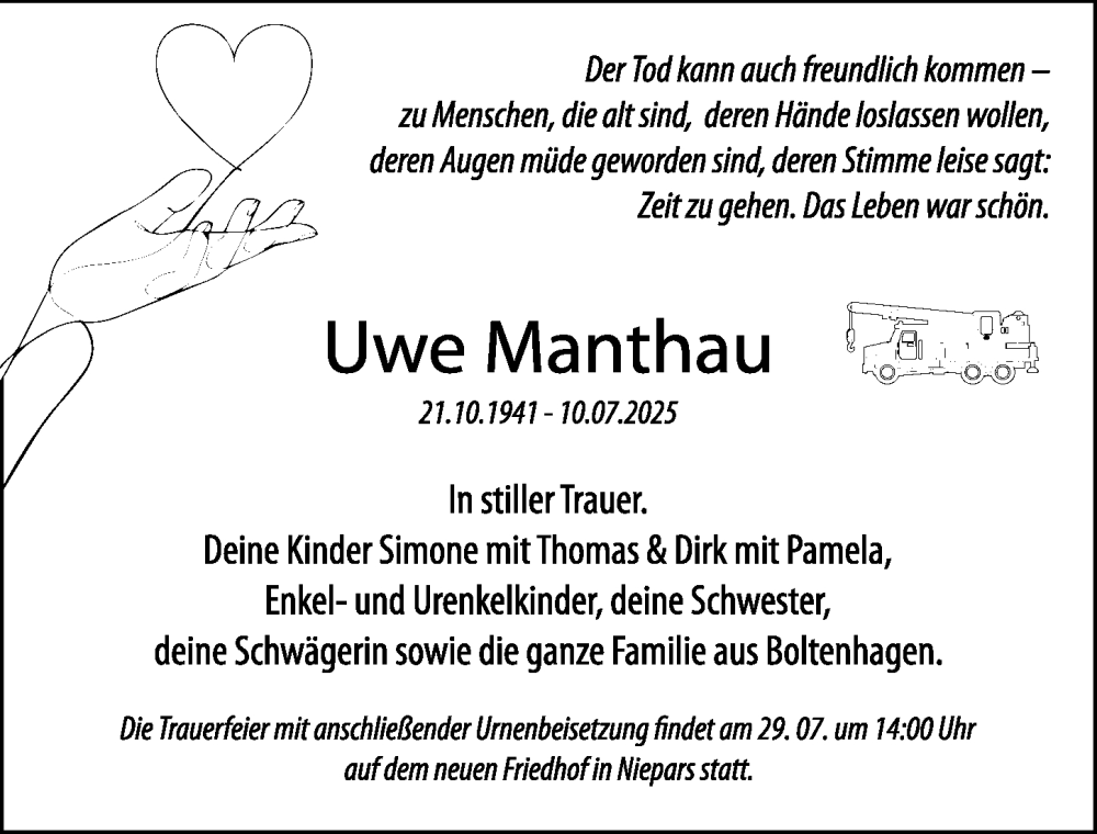 Hier finden Sie alle Traueranzeigen aus der Zeitung, die bisher für Uwe Manthau erschienen sind. Weitere Traueranzeigen, die in der Zeitung erscheinen, werden hier ebenfalls aufgelistet