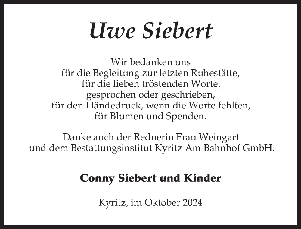 Hier finden Sie alle Traueranzeigen aus der Zeitung, die bisher für Uwe Siebert erschienen sind. Weitere Traueranzeigen, die in der Zeitung erscheinen, werden hier ebenfalls aufgelistet