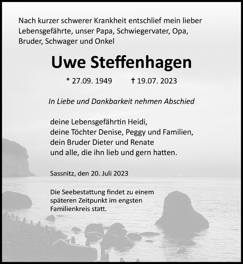 Hier finden Sie alle Traueranzeigen aus der Zeitung, die bisher für Uwe Steffenhagen erschienen sind. Weitere Traueranzeigen, die in der Zeitung erscheinen, werden hier ebenfalls aufgelistet