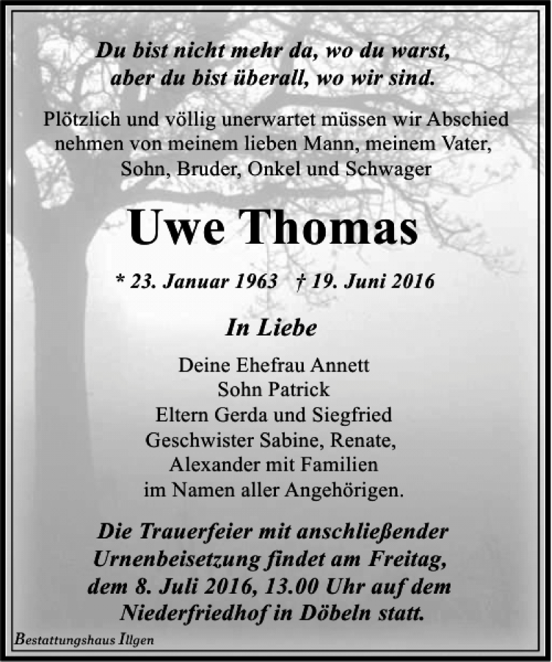 Hier finden Sie alle Traueranzeigen aus der Zeitung, die bisher für Uwe Thomas erschienen sind. Weitere Traueranzeigen, die in der Zeitung erscheinen, werden hier ebenfalls aufgelistet