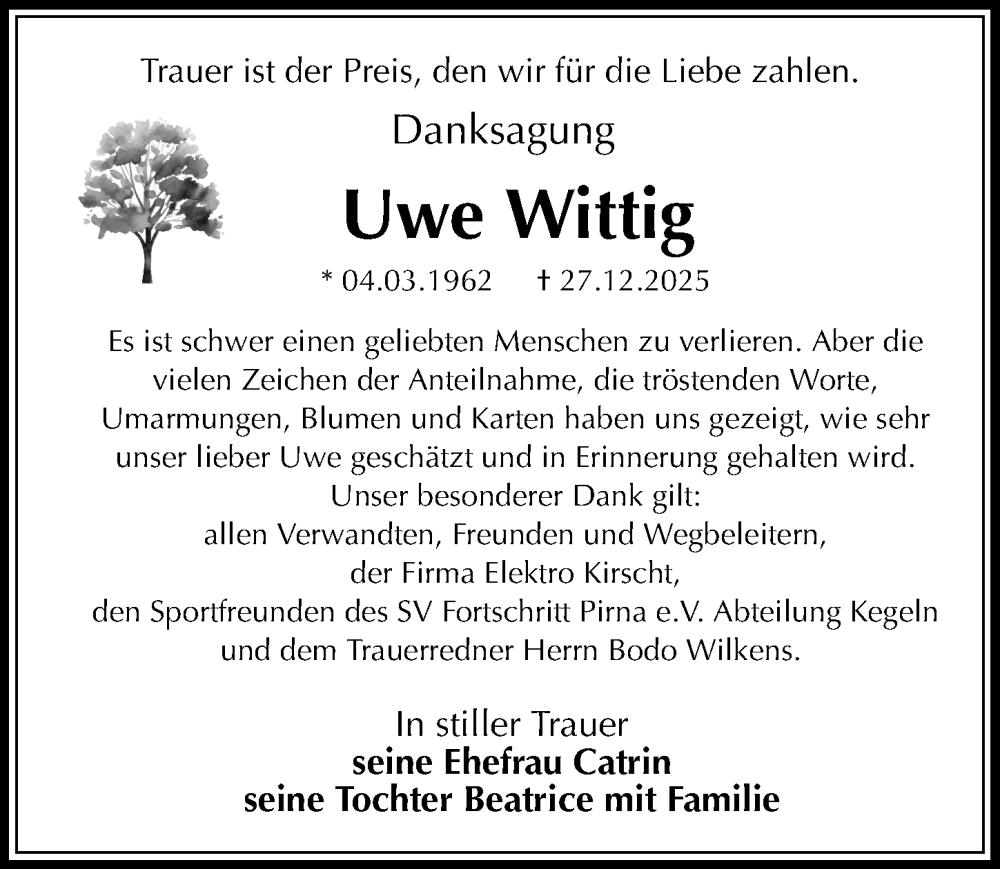 Hier finden Sie alle Traueranzeigen aus der Zeitung, die bisher für Uwe Wittig erschienen sind. Weitere Traueranzeigen, die in der Zeitung erscheinen, werden hier ebenfalls aufgelistet