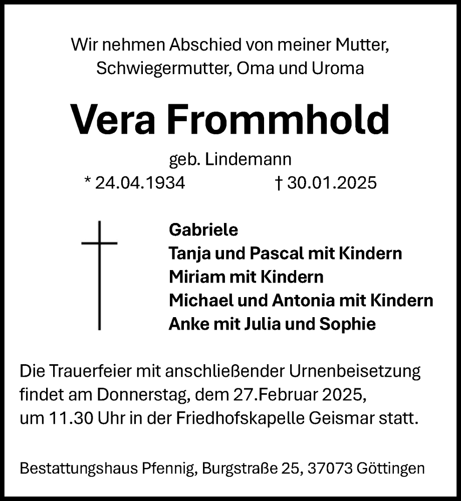 Hier finden Sie alle Traueranzeigen aus der Zeitung, die bisher für Vera Frommhold erschienen sind. Weitere Traueranzeigen, die in der Zeitung erscheinen, werden hier ebenfalls aufgelistet
