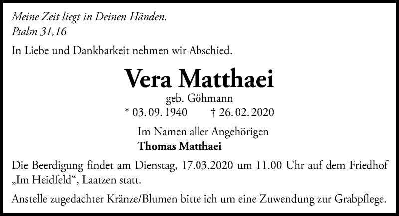 Hier finden Sie alle Traueranzeigen aus der Zeitung, die bisher für Vera Matthaei erschienen sind. Weitere Traueranzeigen, die in der Zeitung erscheinen, werden hier ebenfalls aufgelistet