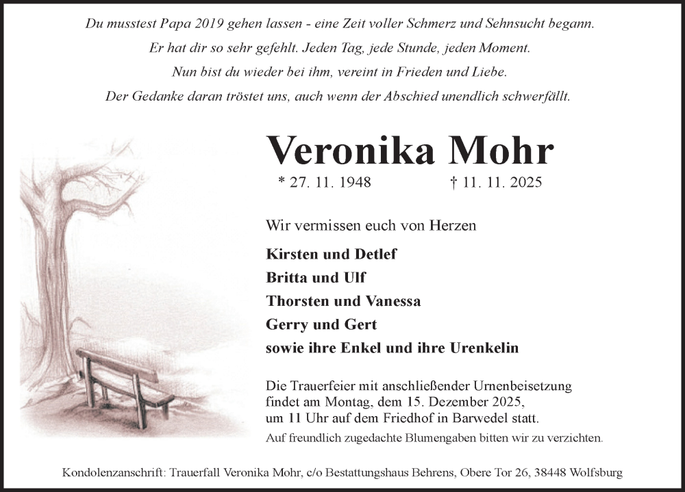 Hier finden Sie alle Traueranzeigen aus der Zeitung, die bisher für Veronika Mohr erschienen sind. Weitere Traueranzeigen, die in der Zeitung erscheinen, werden hier ebenfalls aufgelistet