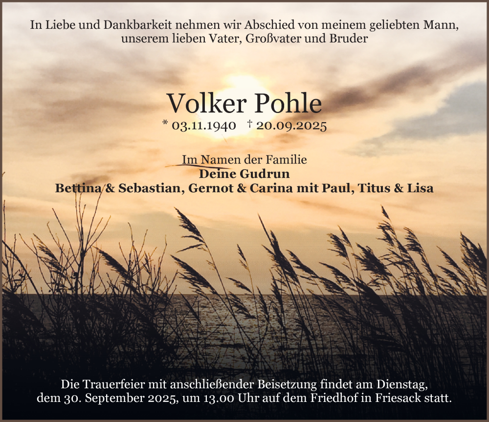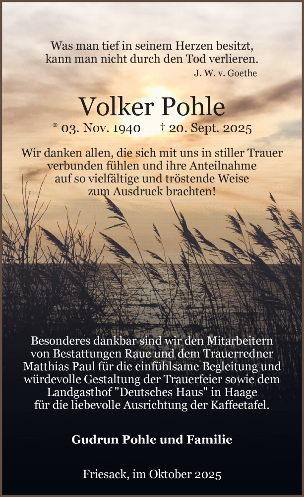 Hier finden Sie alle Traueranzeigen aus der Zeitung, die bisher für Volker Pohle erschienen sind. Weitere Traueranzeigen, die in der Zeitung erscheinen, werden hier ebenfalls aufgelistet