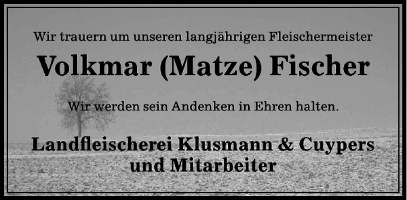 Hier finden Sie alle Traueranzeigen aus der Zeitung, die bisher für Volkmar Matze Fischer erschienen sind. Weitere Traueranzeigen, die in der Zeitung erscheinen, werden hier ebenfalls aufgelistet