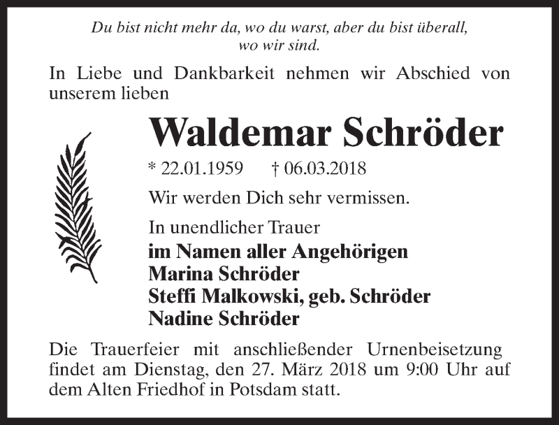 Hier finden Sie alle Traueranzeigen aus der Zeitung, die bisher für Waldemar Schröder erschienen sind. Weitere Traueranzeigen, die in der Zeitung erscheinen, werden hier ebenfalls aufgelistet
