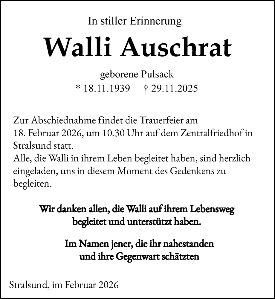 Hier finden Sie alle Traueranzeigen aus der Zeitung, die bisher für Walli Auschrat erschienen sind. Weitere Traueranzeigen, die in der Zeitung erscheinen, werden hier ebenfalls aufgelistet
