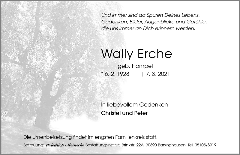 Hier finden Sie alle Traueranzeigen aus der Zeitung, die bisher für Wally Erche erschienen sind. Weitere Traueranzeigen, die in der Zeitung erscheinen, werden hier ebenfalls aufgelistet