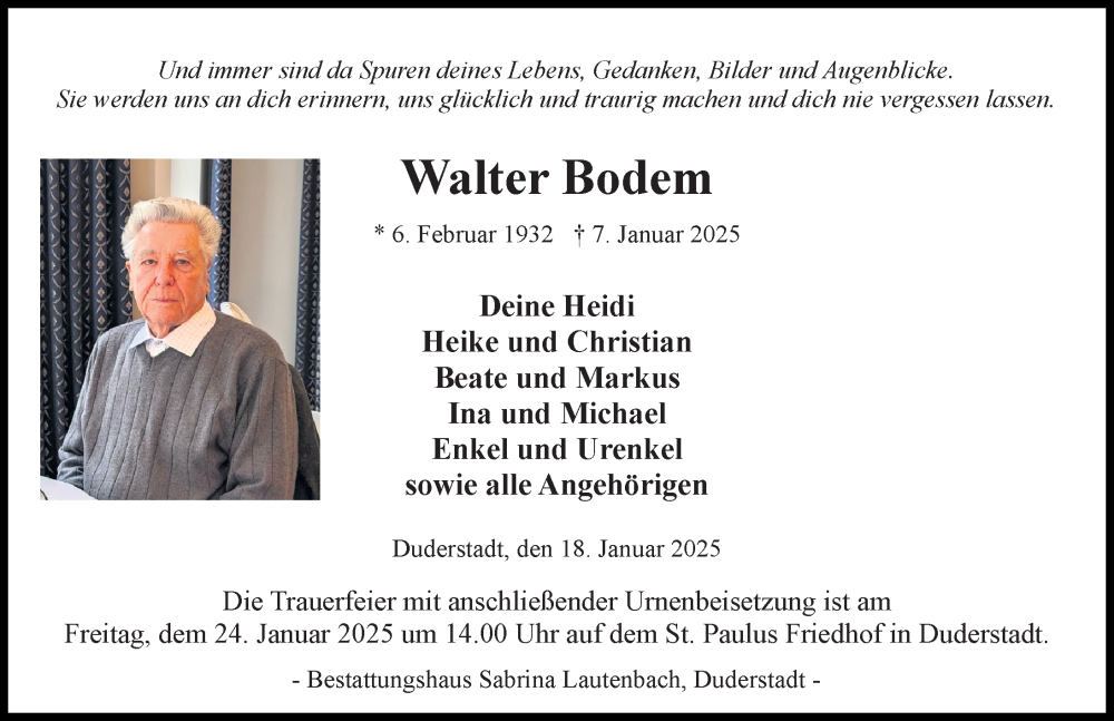 Hier finden Sie alle Traueranzeigen aus der Zeitung, die bisher für Walter Bodem erschienen sind. Weitere Traueranzeigen, die in der Zeitung erscheinen, werden hier ebenfalls aufgelistet