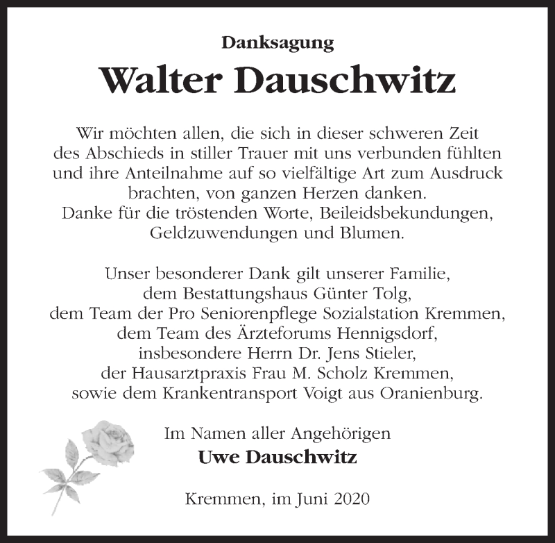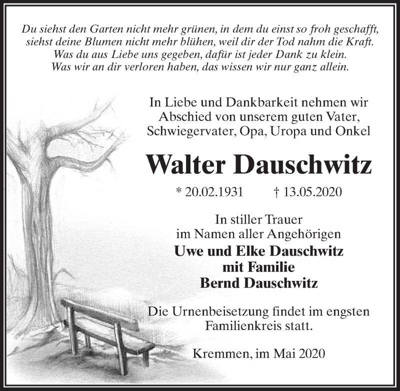 Hier finden Sie alle Traueranzeigen aus der Zeitung, die bisher für Walter Dauschwitz erschienen sind. Weitere Traueranzeigen, die in der Zeitung erscheinen, werden hier ebenfalls aufgelistet