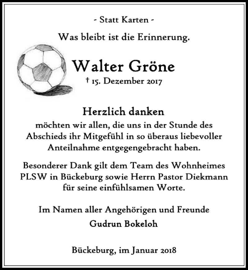 Hier finden Sie alle Traueranzeigen aus der Zeitung, die bisher für Walter Gröne erschienen sind. Weitere Traueranzeigen, die in der Zeitung erscheinen, werden hier ebenfalls aufgelistet