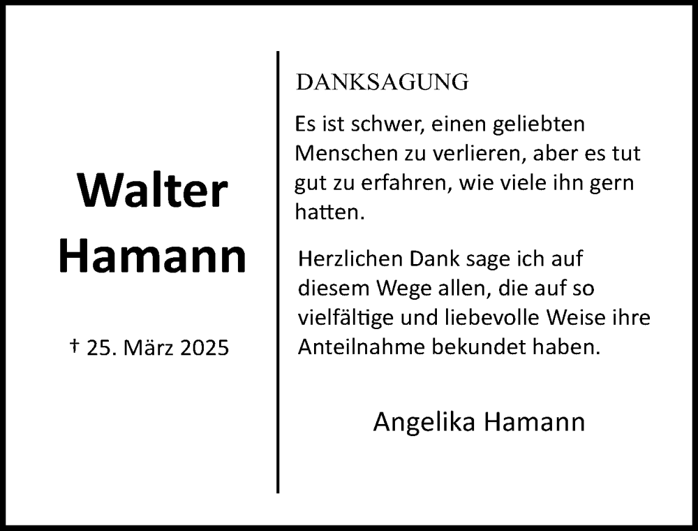 Hier finden Sie alle Traueranzeigen aus der Zeitung, die bisher für Walter Hamann erschienen sind. Weitere Traueranzeigen, die in der Zeitung erscheinen, werden hier ebenfalls aufgelistet