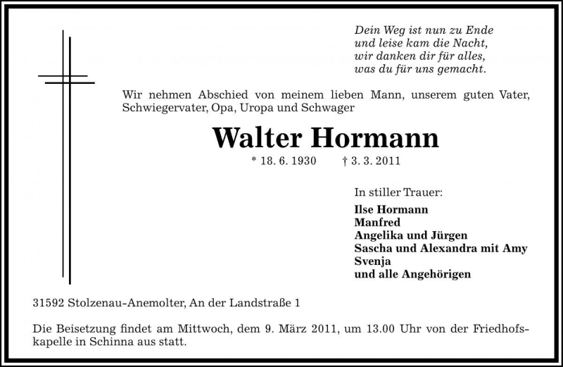 Hier finden Sie alle Traueranzeigen aus der Zeitung, die bisher für Walter Hormann erschienen sind. Weitere Traueranzeigen, die in der Zeitung erscheinen, werden hier ebenfalls aufgelistet