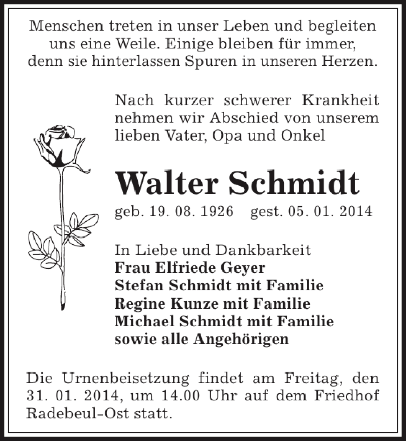 Hier finden Sie alle Traueranzeigen aus der Zeitung, die bisher für Walter Schmidt erschienen sind. Weitere Traueranzeigen, die in der Zeitung erscheinen, werden hier ebenfalls aufgelistet