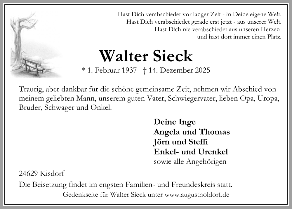 Hier finden Sie alle Traueranzeigen aus der Zeitung, die bisher für Walter Sieck erschienen sind. Weitere Traueranzeigen, die in der Zeitung erscheinen, werden hier ebenfalls aufgelistet