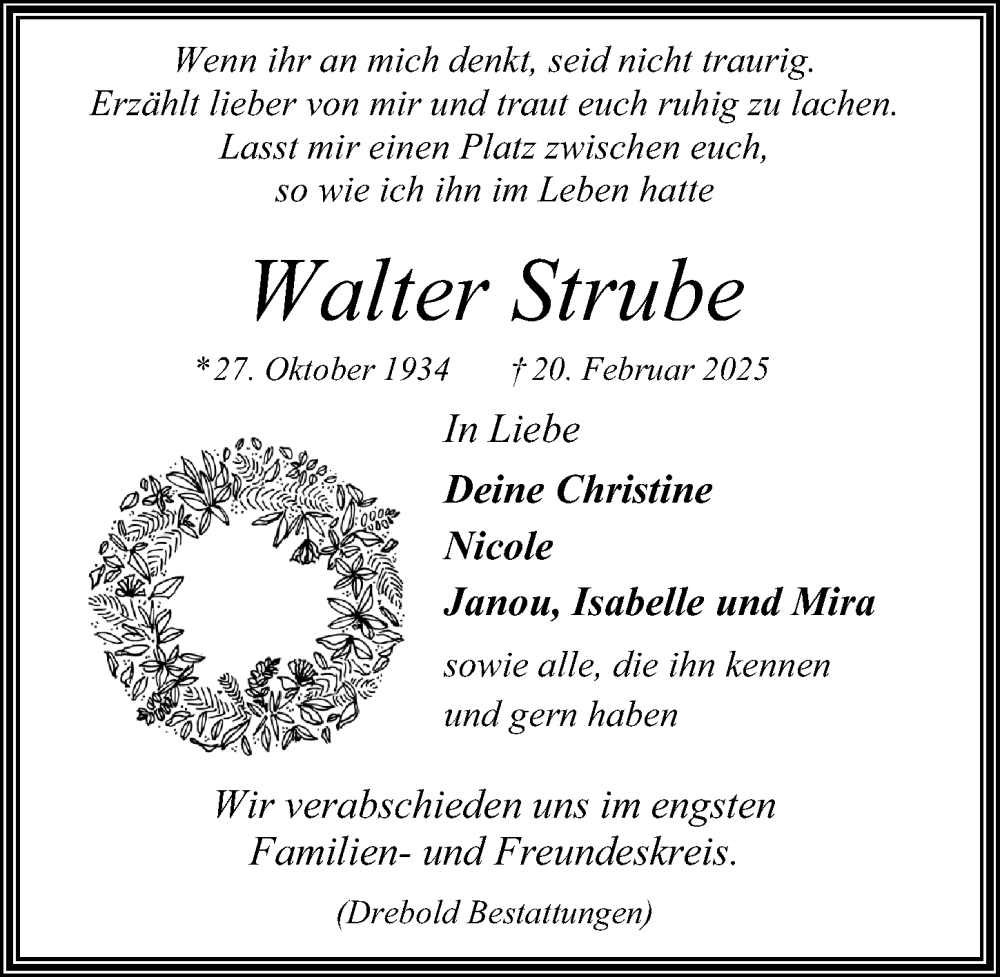 Hier finden Sie alle Traueranzeigen aus der Zeitung, die bisher für Walter Strube erschienen sind. Weitere Traueranzeigen, die in der Zeitung erscheinen, werden hier ebenfalls aufgelistet