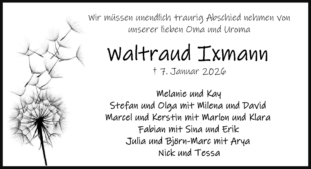 Hier finden Sie alle Traueranzeigen aus der Zeitung, die bisher für Waltraud Ixmann erschienen sind. Weitere Traueranzeigen, die in der Zeitung erscheinen, werden hier ebenfalls aufgelistet