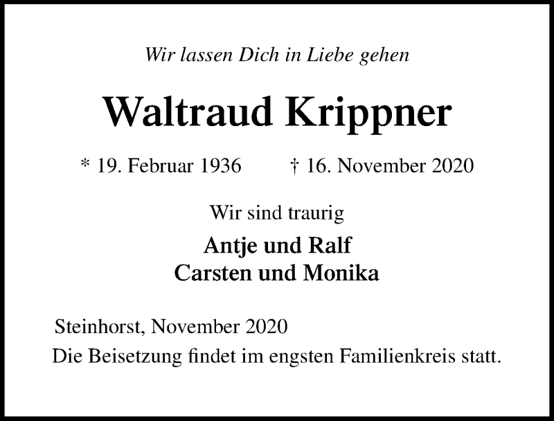 Hier finden Sie alle Traueranzeigen aus der Zeitung, die bisher für Waltraud Krippner erschienen sind. Weitere Traueranzeigen, die in der Zeitung erscheinen, werden hier ebenfalls aufgelistet