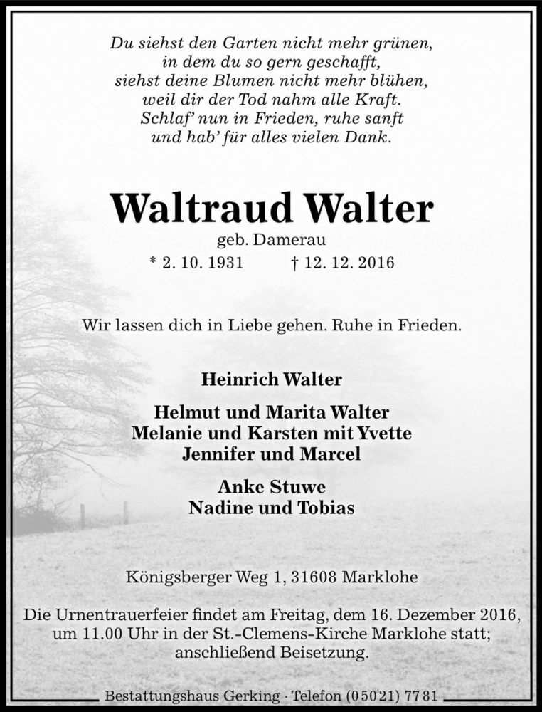 Hier finden Sie alle Traueranzeigen aus der Zeitung, die bisher für Waltraud Walter erschienen sind. Weitere Traueranzeigen, die in der Zeitung erscheinen, werden hier ebenfalls aufgelistet